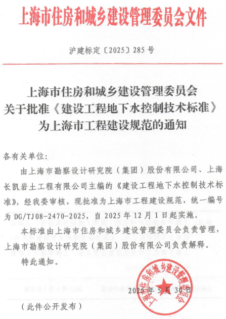由上海勘察设计研究院(集团)股份有限公司、上海长凯岩土工程有限公司主编的《建设工程地下水控制技术标准》,经上海市住房和城乡建设管理委员会审核,批准为上海市工程建设规范,统一编号为DG/TJ08-2470-2025,将于2025年12月1日起正式实施。